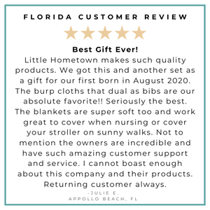 Little Hometown makes such quality products. We got this and another set as a gift for our first born in August 2020. The burp cloths that dual as bibs are our absolute favorite!! Seriously thee best. The blankets are super soft too and work great to cover when nursing or cover your stroller on sunny walks. Not to mention the owners are incredible and have such amazing customer support and service. I cannot boast enough about this company and their products. Returning customer always.