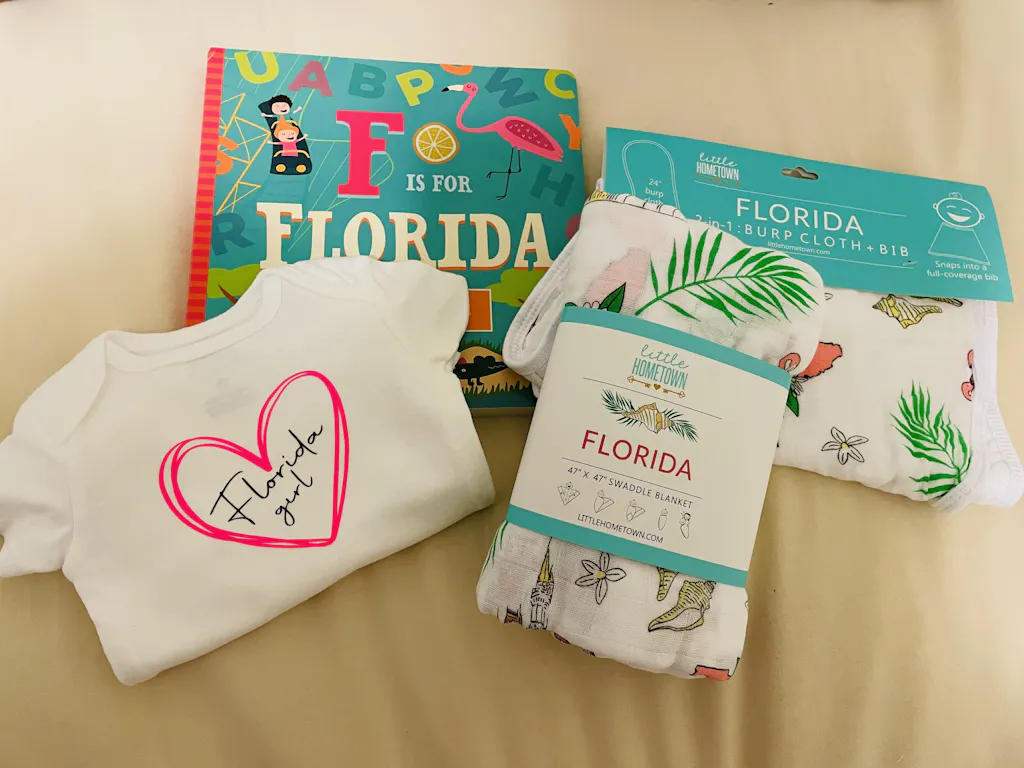 Palm leaves, conch shells, flamingos, orange blossoms, and a castle, you can't find a cuter gift for your newest Floridian.