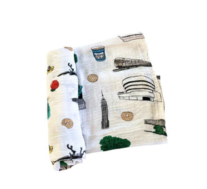 1 Our fan-favorite NYC baby swaddle. 47"x47" organic cotton & bamboo fiber muslin swaddle blanket. Super soft and super vibrant