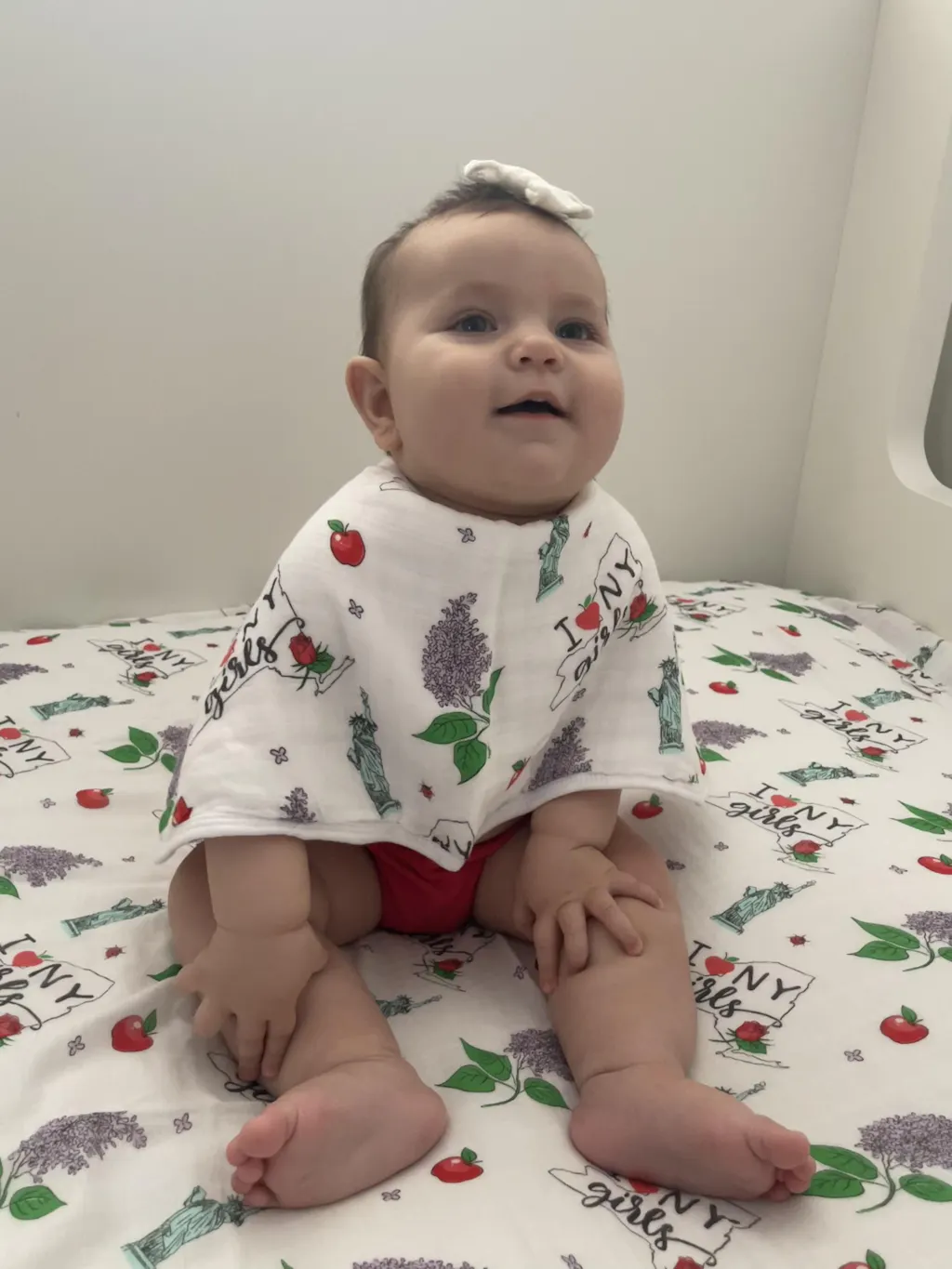 Celebrating the natural beauty of New York with apples, roses, ladybugs, and lilacs, this is the perfect gift for the newest little Lady Liberty in your life!