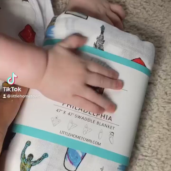 1 Our fan-favorite Philly baby swaddle. 47"x47" organic cotton & bamboo fiber muslin swaddle blanket. Super soft and super vibrant