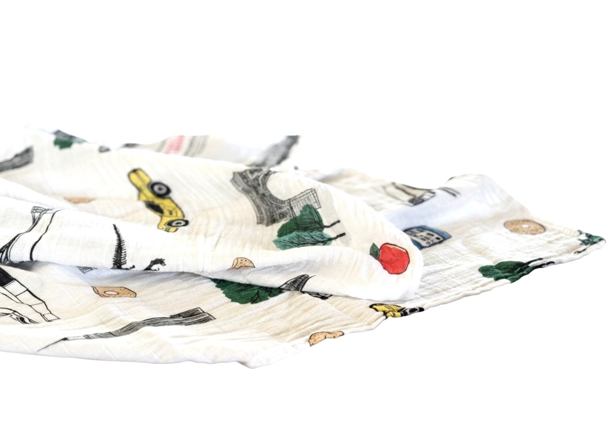 1 Our fan-favorite NYC baby swaddle. 47"x47" organic cotton & bamboo fiber muslin swaddle blanket. Super soft and super vibrant