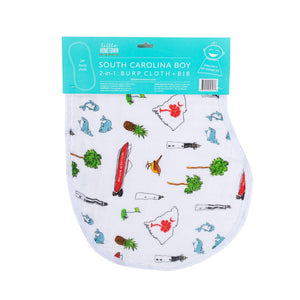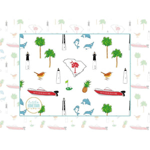 The perfect gift for the South Carolina boy in. your life! Our design features: the Palmetto Moon, pineapples, Carolina Wrens, distinctive SC lighthouses, and bottlenosed dolphins.